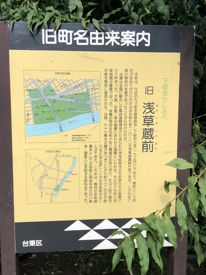 この付近に御米蔵があったことから、元和7年(1621年)に初めて「浅草御蔵前片町」という地名が付けられました。そして、江戸時代中期以降、この御米蔵の西側にある地域を「蔵前」と呼ぶようになったのです。