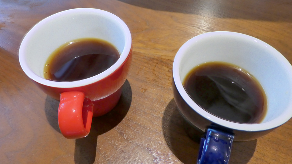 紺のカップが中煎りのグアテマラです。赤のカップが浅煎りのエチオピアです。味がソフトな浅煎りエチオピアの方がら飲まれた方が判りやすいかもしれません。