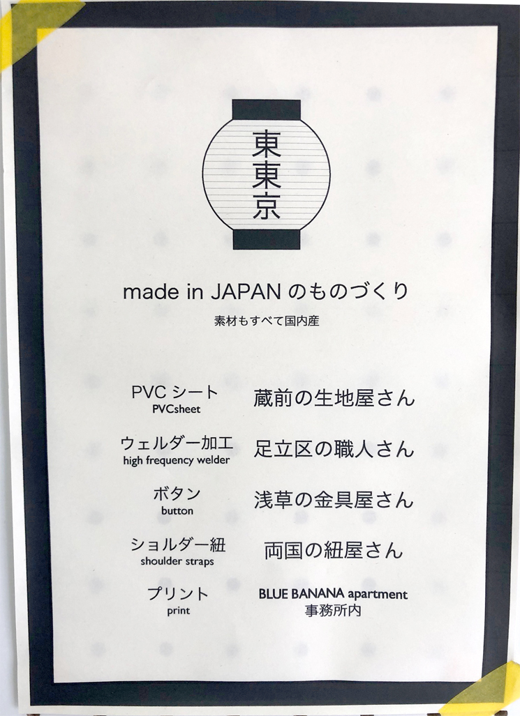 素材も三筋の会社さんのビニールを使っているんですけど、こちらも、どういったビニール素材があるのかなとリサーチしていくなかで出会って。すごい色味が綺麗だったんで、これで製品化したいと社長さんに話したところ、最初サンプルから買わせていただいて、自分たちのやりたいことをお話したら、ご協力してくださいました。
