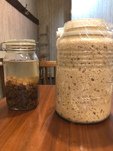 これが上がってきて下に澱が溜まるんですけど、そうすると酵母の出来上がり。それが元液で、そこに全粒粉を混ぜて発酵させます。ブドウ酵母を濾した元液と全粒粉を混ぜると、「プクプク」と右側のビンのように上がってくるんです。これが自家製酵母の元の膨らませる種になって、自家製酵母のバケットなどはこれを使っています。