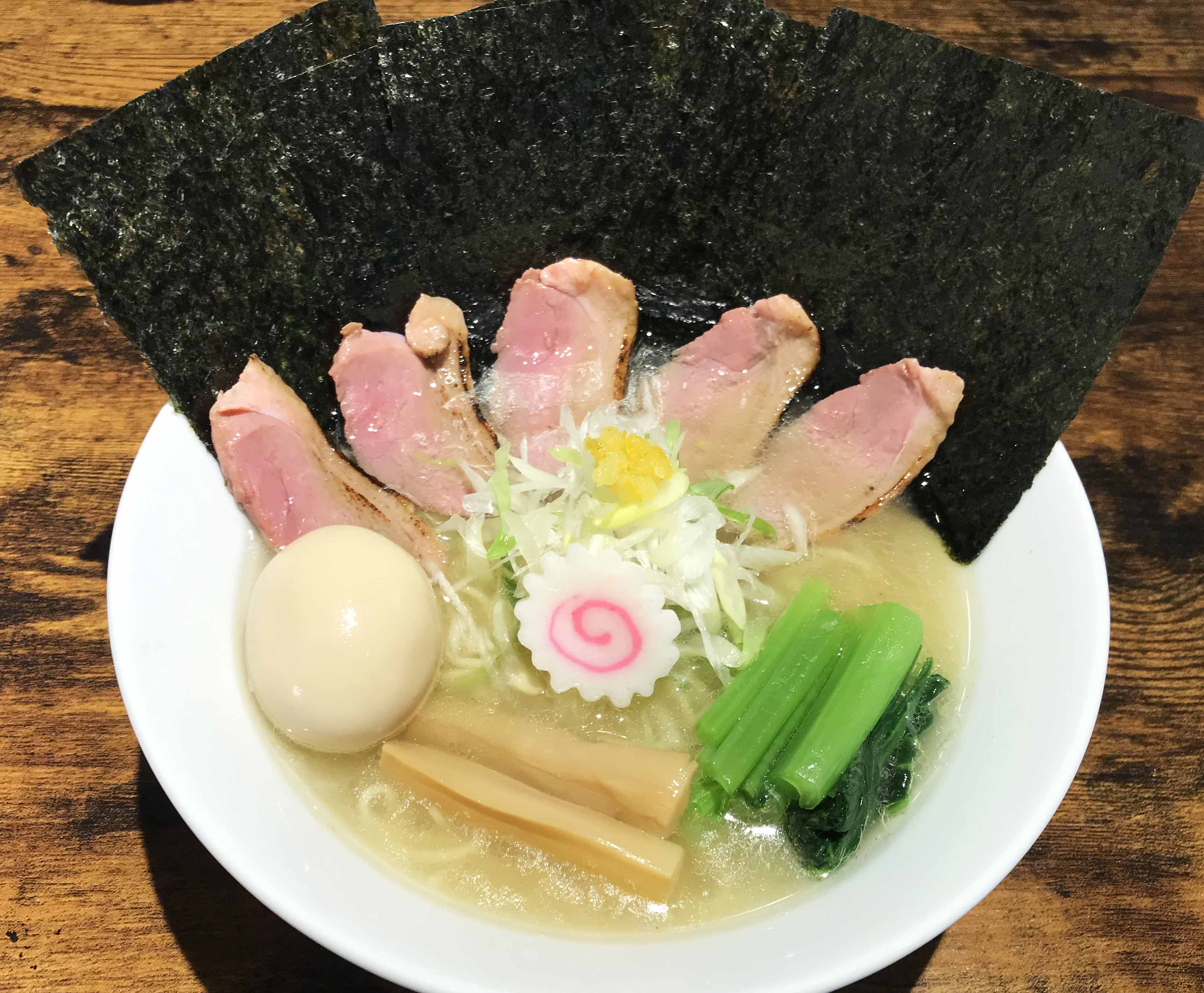 筆者もさっそく「鴨塩特製」を試食させていただきました。白い浅めの上品な器に、鴨胸肉のチャーシューと海苔が花びらのように盛り付けられ、手前に味玉とメンマと小松菜、そして中央に葱となるとが鎮座するオールスターキャストです。